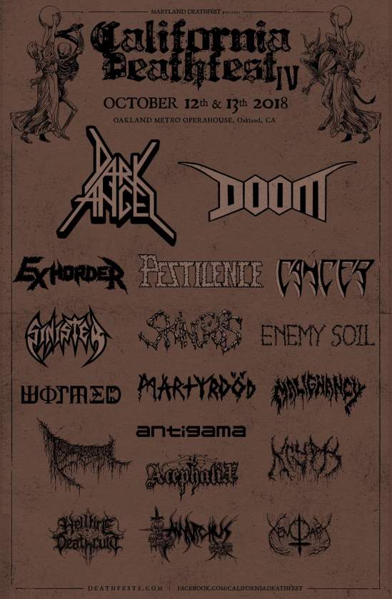 More bands have been added to the 2018 California Deathfest. The event will take place on October 12-13 at the Oakland Metro Operahouse in Oakland, CA and the updated lineup includes: Dark Angel, Doom, Exhorder, Pestilence, Cancer, Sinister, Skinless, Enemy Soil, Wormed, Martyrdöd, Malignancy, Antigama, Triumvir Foul, Acephalix, Krypts, Hellfire Deathcult, Anarchus, and Xenotaph.