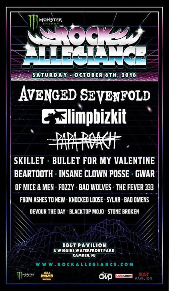 The lineup has been revealed for the 2018 Rock Allegiance festival. The event will take place on October 6 at BB&T Pavilion & Wiggins Waterfront Park in Camden, NJ, and the following artists have been booked: Avenged Sevenfold, Limp Bizkit, Papa Roach, Skillet, Bullet For My Valentine, Beartooth, Insane Clown Posse, Gwar, Of Mice & Men, Fozzy, Bad Wolves, The Fever 333, From Ashes To New, Knocked Loose, Sylar, Bad Omens, Devour The Day, Blacktop Mojo, and Stone Broken.