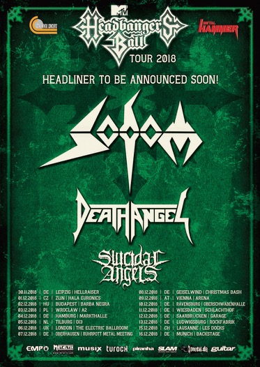 Sodom, Death Angel, and Suicidal Angels are set to head out on the 2018 MTV Headbanger’s Ball Tour in Europe. You can see the dates for that run below. A headliner will be announced soon.
