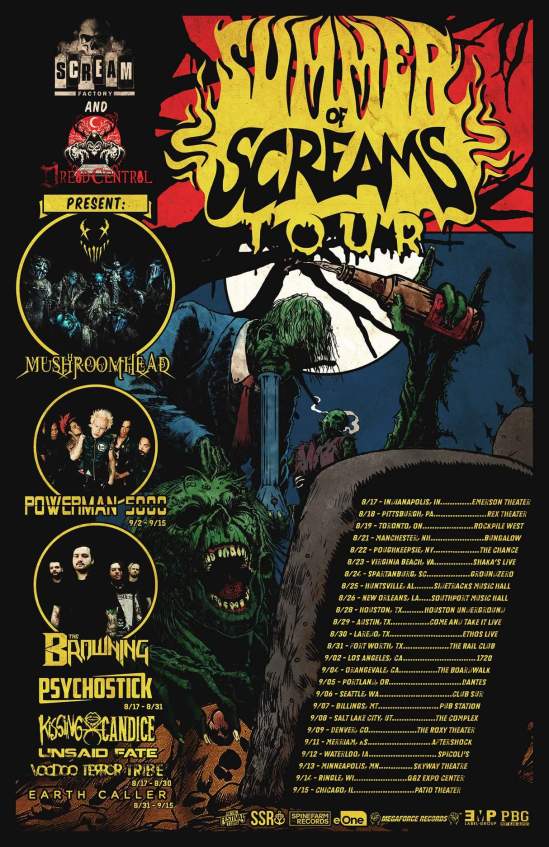 Mushroomhead have been confirmed as the headliner of the inaugural “Summer Of Screams” tour. They will also be joined by Powerman 5000 (09/02-09/15), Psychostick (08/17-08/31), The Browning, Kissing Candice, UnSaid Fate, Voodoo Terror Tribe (08/17-08/30), and Earth Caller (08/31-09/15).