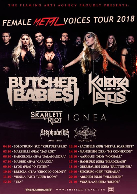Butcher Babies, Kobra And The Lotus, Skarlett Riot, and Ignea have announced that they will be hitting the road on the “Female Metal Voices” tour in Europe. Asphodelia and MartYriuM will also perform on select dates.