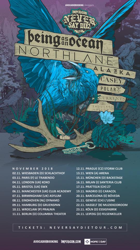 Being As An Ocean, Northlane, Alazka, Casey, Polar, Currents, and Thousand Below have all been booked for the 2018 Impericon Never Say Die! Tour in Europe. Being As An Ocean will serve as the headliners for the mainland European dates, while Northlane will serve as the headliners for the UK dates.