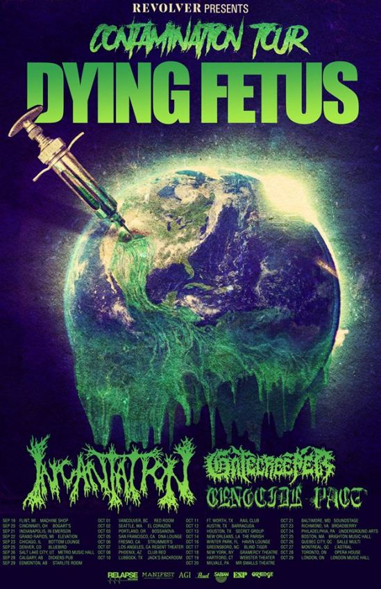 Dying Fetus, Incanation, Gatecreeper, and Genocide Pact will be hitting the road on the “Relapse Contamination Tour.” You can see the dates for that run below. On another note, a new spit release featuring all four bands will be released on September 7. That effort can be pre-ordered HERE and it will include the following tracks: Dying Fetus’ “Fixated On Devastation” and “Panic Amongst The Herd”, Incantation’s “Muse” and “Rites Of The Locust”, Gatecreeper’s “Craving Flesh” and “Stronghold”, and Genocide Pact’s “Conquered And Disposed” and “Pain Reprisal.”