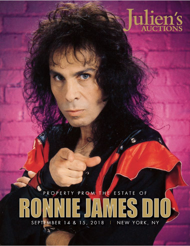 Julien’s Auctions have announced a “Property From The Estate Of Ronnie James Dio” auction, which is set to take place at The Hard Rock Café in New York on September 14-15. The auction will feature a number of items from his early days in Rainbow, things from his time with Black Sabbath, and stuff from his solo band. Among the items included are a sticker-covered wardrobe case, stage clothing, a white Charvel guitar, the Barry Jackson painting that was used as the cover for “The Last In Line”, gold sales plaques, the animatronic sphinx from the “Last in Line” tour, a dragon’s head from the “Sacred Heart”, etc. People will be able to bid on everything in person and online. More info can be found HERE. Wendy Dio commented: