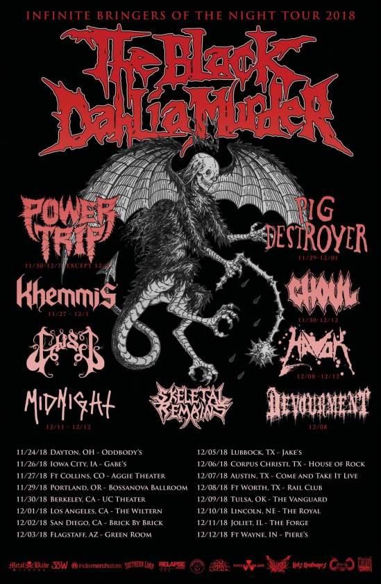 The Black Dahlia Murder have announced a fall headlining tour. Gost and Skeletal Remains will perform throughout the whole trek, while Power Trip, Pig Destroyer, Khemmis, Ghoul, Havok, Midnight, and Devourment will perform on select dates.