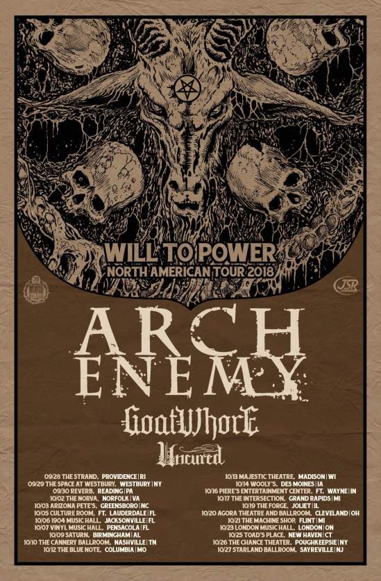“We very much regret to inform you that we will be postponing our return to North America until 2019. We were looking forward to seeing everyone again this Fall and to share our stage with Goatwhore and Uncured, but we have been forced to cancel this run due to reasons beyond our control. It’s very unfortunate timing, but we cannot wait to come back and rock US soil again next year and see all your faces! Thank you for understanding and as always for your support of Arch Enemy! Ticket and VIP refunds are available at point of purchase.”
