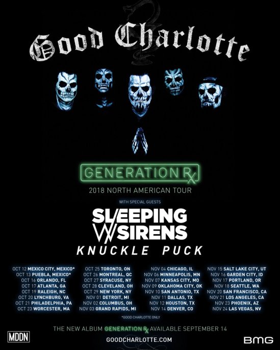 Good Charlotte have confirmed that Sleeping With Sirens and Knuckle Puck will be the opening acts on their upcoming North American tour. The group will be touring in support of their new album “Generation Rx” (out September 14).