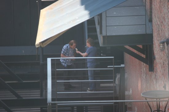 Rumors of a new AC/DC album are continuing to flare up. Just one day after a photo surfaced showing Brian Johnson and Phil Rudd outside Warehouse Studios in Vancouver, BC, another photo has emerged showing Angus and Stevie Young in the same location. The band previously recorded their last three albums at the studio. Like the last one, the latest picture was taken by Crystal Lambert, who has an apartment near the studio, and Glenn Slavens. An umbrella has since been installed at the studio to prevent further photos.