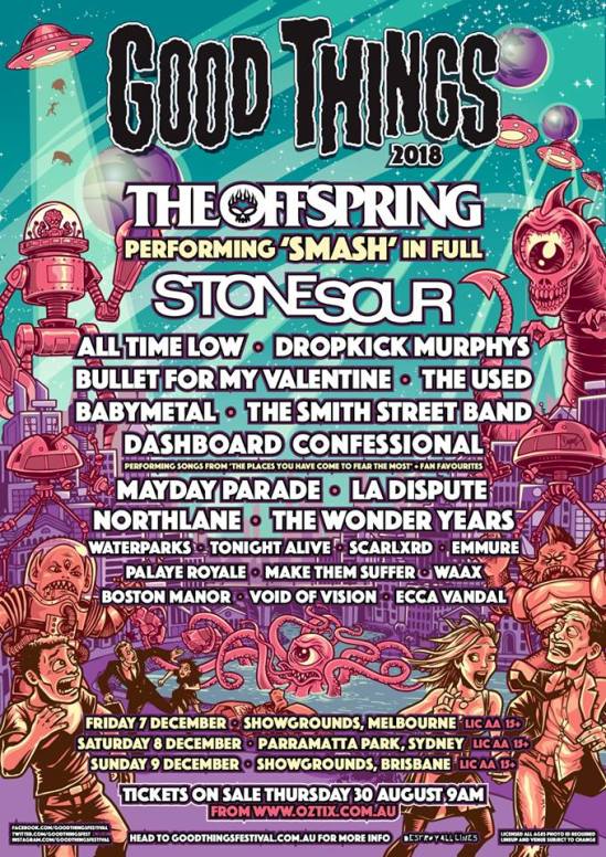 The lineup has been revealed for the 2018 Good Things festival. The event will feature all of the following: The Offspring (performing “Smash” in full), Stone Sour, All Time Low, Dropkick Murphys, Bullet For My Valentine, The Used, BABYMETAL, The Smith Street Band, Dashboard Confessional (performing songs from “The Places You Have Come To Fear The Most” & more), Mayday Parade, La Dispute, Northlane, The Wonder Years, Waterparks, Tonight Alive, Scarlxrd, Emmure, Palaye Royale, Make Them Suffer, Waax, Boston Manor, Void Of Vision, and Ecca Vandal. Here’s the dates: