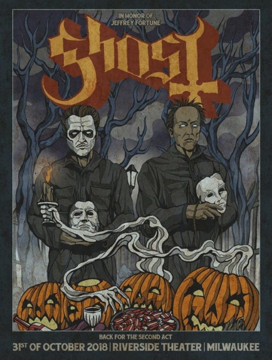 Ghost previously cut their May 31 show at the Riverside Theater in Milwaukee, WI short after a man named Jeff Fortune collapsed and later died. Now, the band have announced that they will be returning to the venue to honor the fan by finishing the concert on Halloween (October 31). Those who attend will be able to buy a special shirt, featuring Cardinal Copia and Fortune wearing Michael Myers costumes, and proceeds from it will go towards Fortune’s family.
