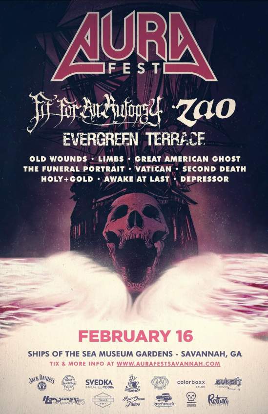 The lineup has been revealed for the 2019 Aura Fest. The event will be held on February 16 at the Ships Of The Sea Museum Gardens in Savannah, GA and it will feature: Fit For An Autopsy, Zao, Evergreen Terrace, Old Wounds, Limbs, Great American Ghost, The Funeral Portrait, Vatican, Second Death, Holy+Gold, Awake At Last, and Depressor.