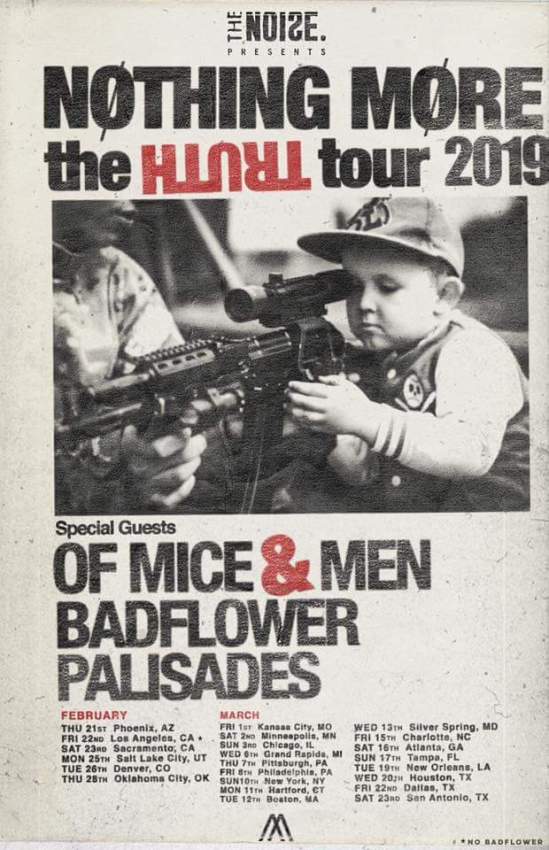 Nothing More have announced a headlining tour with Of Mice & Men, Badflower, and Palisades. The band are teaming up with Headcount and To Write Love On Her Arms for the trek and both organizations will have booths at each show. $1 from every ticket sold will go towards To Write Love On Her Arms as well.