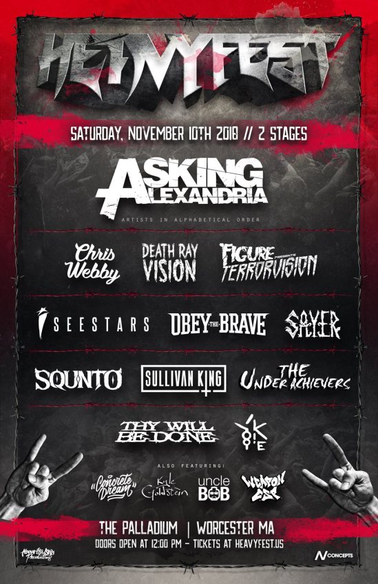 The lineup has been revealed for the 2018 Heavy Fest. The event will take place at The Palladium in Worcester, MA on November 10 and it will feature: Asking Alexandria, Chris Webby, Death Ray Vision, Figure Presents Terrorvision, I See Stars, Obey The Brave, Sayer, Squnto, Sullivan King, The Underachievers, Thy Will Be Done, Concrete Dream, Kyle Goldenstein, Uncle Bob, and Weapon E.S.P.