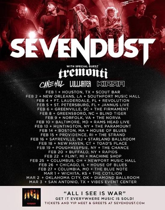 Sevendust have announced a headlining U.S. tour. Tremonti, Cane Hill, Lullwater, and Kirra will serve as support.