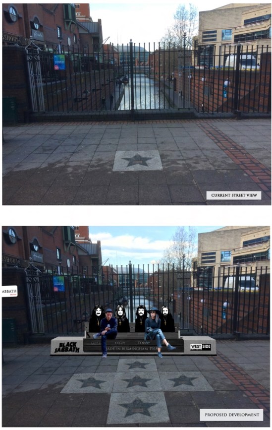 According to BirminghamLive, West Side business development and the city of Birmingham, England may honor Black Sabbath with a “Black Sabbath Bridge” on the stretch of Broad Street over the canal next to Symphony Hall and the ICC. Furthermore, they also want to give Bill Ward his own star on the Walk Of Stars, so each original member is represented. They will then take all the stars and add an official one for the band itself so they have enough to put them in the shape of a cross in front of a special tribute bench. Egyptian-born Sabbath fan Mohammed Osamaidea came up with idea and had the following to say: