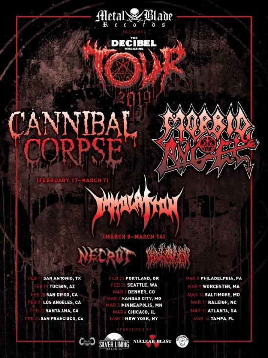 The lineup has been revealed for the 2019 Decibel Magazine Tour. The trek will feature Cannibal Corpse, Morbid Angel, Necrot, and Blood Incantation. Cannibal Corpse will only perfom from February 17 – March 7. After that, Morbid Angel will headline with direct support from Immolation.