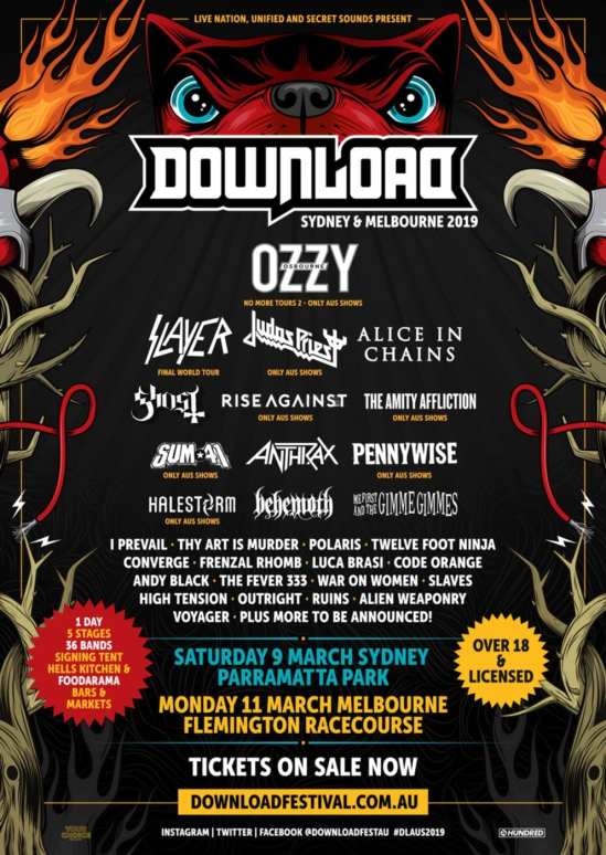 More bands have been added to the 2019 Australian Download Festival. The event will take place in Sydney (March 9 at the Parramatta Park) and Melbourne (March 11 at the Flemington Racecourse) and the newly announced acts include: Sum 41, Pennywise, Thy Art Is Murder, Polaris, Twelve Foot Ninja, Slaves, and Voyager. Previously announced artists include: Ozzy Osbourne, Slayer, Judas Priest, Alice In Chains, Ghost, Rise Against, The Amity Affliction, Anthrax, Halestorm, Behemoth, Me First And The Gimmie Gimmes, I Prevail, Converge, Frenzal Rhomb, Luca Brasi, Code Orange, Andy Black, The Fever 333, War On Women, High Tension, Outright, Ruins, and Alien Weaponry.