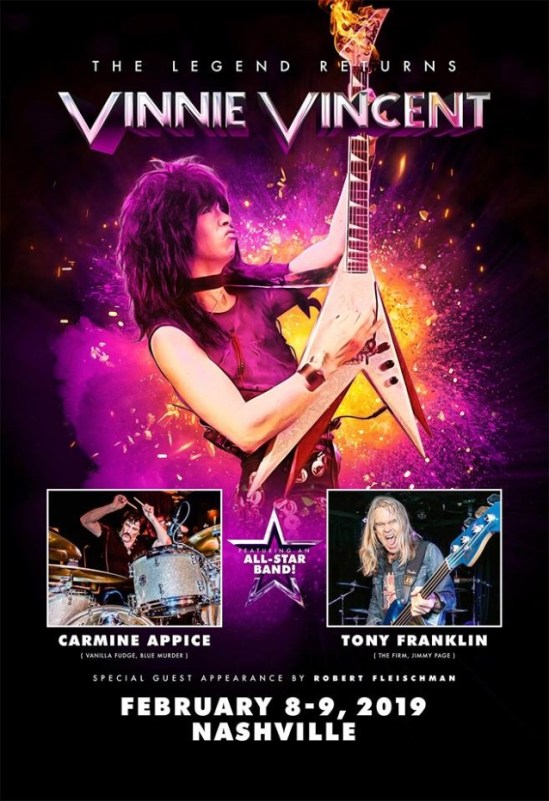 Former KISS guitarist Vinnie Vincent’s December 7-8 shows at Graceland in Memphis, Tennessee have now been postponed until February 8-9. Tickets for the December 7 show will be honored on February 8, while tickets for the December 8 show will be honored on February 9. Refunds will also be available at vinnievincentlive.com. Carmine Appice and Tony Franklin will join Vincent on the new dates. Promoter Derek Christopher commented: