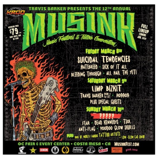 The initial lineup has been revealed for Travis Barker’s (Blink-182) annual Musink festival. The event will take place at the OC Fair & Event Center in Costa Mesa, CA on March 8-10 and it will feature music, tattoo artists, cars, and more. Here’s the daily lineups: