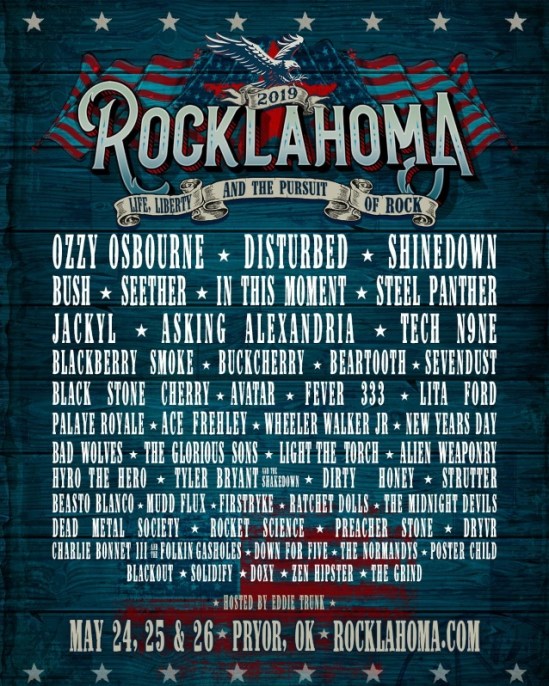 The lineup has been revealed for the 2019 Rocklahoma Festival. The event will take place in Pryor, OK on May 24-26 and it will feature: Ozzy Osbourne, Disturbed, Shinedown, Bush, Seether, In This Moment, Steel Panther, Jackyl, Asking Alexandria, Tech N9ne, Blackberry Smoke, Buckcherry, Beartooth, Sevendust, Black Stone Cherry, Avatar, Fever 333, Lita Ford, Palaye Royale, Ace Frehley, Wheeler Walker Jr, New Years Day, Bad Wolves, The Glorious Sons, Light The Torch, Alien Weaponry, Hyro The Hero, Tyler Bryant And The Shakedown, Dirty Honey, Strutter, Beasto Blanco, Mudd Flux, Firststryke, Ratchet Dolls, The Midnight Devils, Dead Metal Society, Rocket Science, Preacher Stone, Dryvr, Charlie Bonnet III And The Folkin’ Gasholes, Down For Five, The Normandys, Poster Child, Blackout, Solidify, Doxy, Zen Hipster, and The Grind.