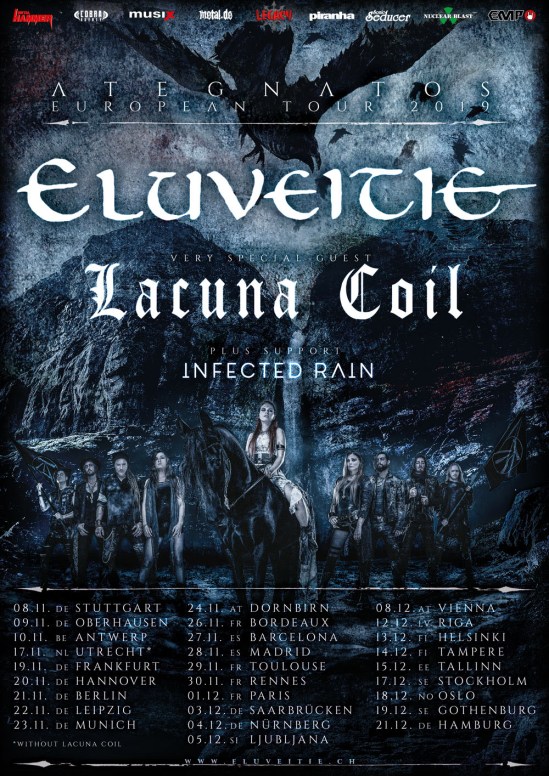 “Our last few months have been extremely intense, creating ‘Ategnatos’. Now we simply cannot wait to bring our new songs to the stages and to share our passion, pure fucking metal and heartfelt Celtic mysticism with you all! And all the more we’re excited to bring such great bands with us! We feel honored to team up with our fellows of the heavyweight institution called Lacuna Coil and also with the amazing wizkid that is Infected Rain, whom we’ve shared festival stages with a few times already!”