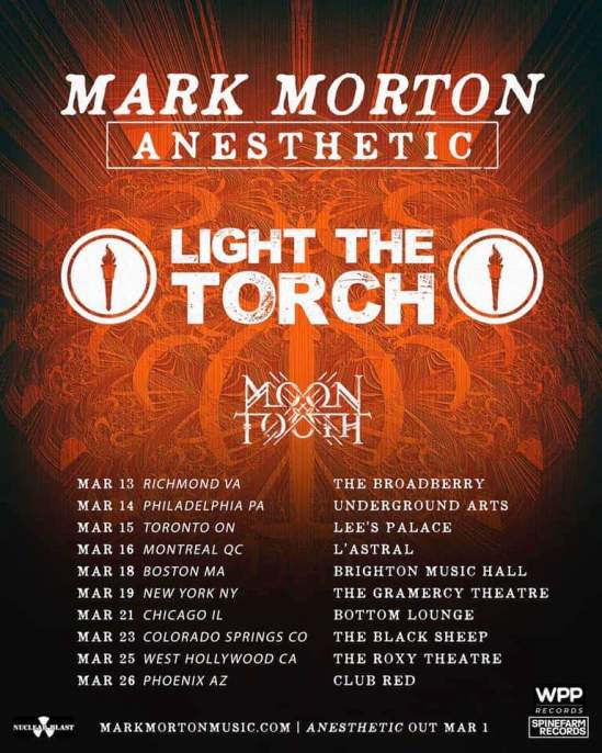 Lamb Of God’s Mark Morton has announced a tour in support of his new solo album “Anesthetic” (out March 1). Light The Torch will co-headline the trek, while Moon Tooth will open. Here’s the dates: