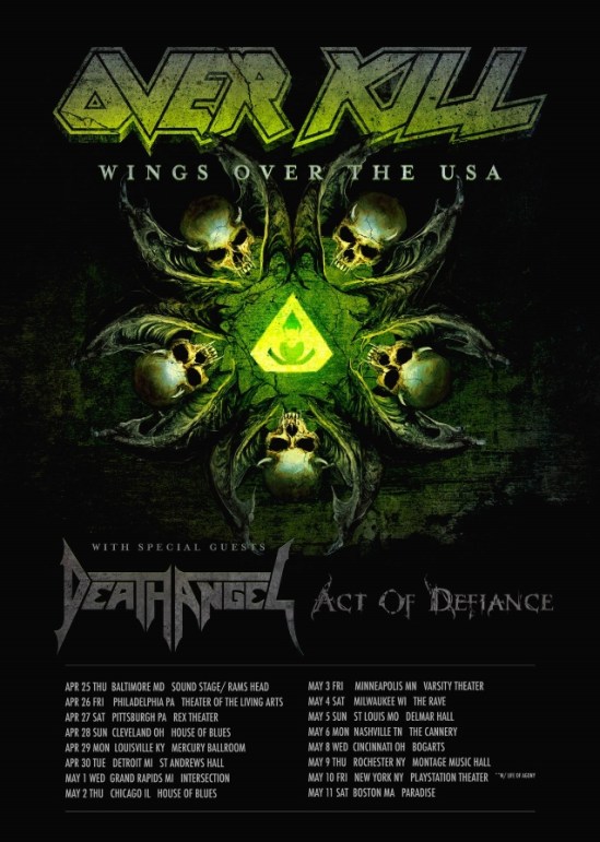 Overkill have announced a headlining tour in support of their album “The Wings Of War“ (out February 22). Death Angel and Act Of Defiance will serve as support.