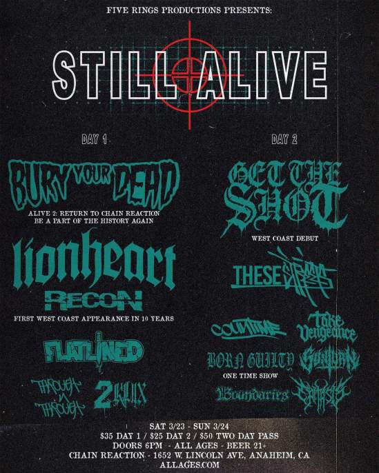 Bury Your Dead have announced that they will be performing the setlist from their 2005 DVD “Alive“ at Still Alive Fest in Anaheim, CA. That event will take place on March 23-24 at the Chain Reaction and it will also feature Get The Shot, Lionheart, These Streets, Recon, and more. Bury Your Dead’s Mat Bruso commented: