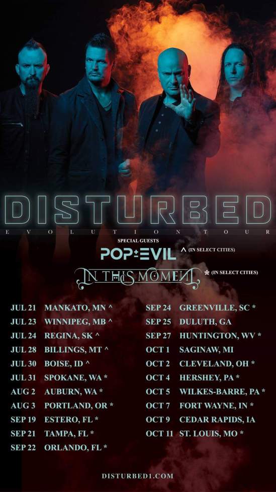 Disturbed have announced a headlining North American tour. In This Moment and Pop Evil will join the band on select dates.