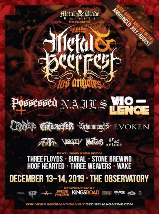 The initial lineup has been revealed for the 2019 Decibel Magazine Metal & Beer Fest in Los Angeles. The event will take place at The Observatory in Santa Ana, CA on December 13-14 and it will feature the following bands: Possessed, Nails, Vio-lence, Cadaver, Gatecreeper, Schammasch, Evoken, Spirit Adrift, Visigoth, Mortuous, and Graf Orlock. The following breweries will also take part in the festival: Three Floyds, Burial, Wake, Hoof Hearted, Stone, and Three Weavers.