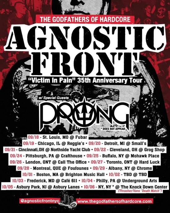 Agnostic Front have announced a headlining tour with Prong. The band will continue to celebrate the 35th anniversary of “Victim In Pain” on this run.