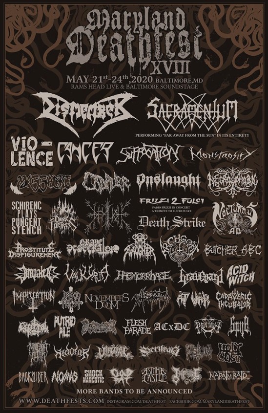 More bands have been added to the 2020 Maryland Deathfest. The event will take place at Rams Head Live and Baltimore Soundstage in Baltimore, MD on May 21-24 and the updated lineup includes: ACxDC, Acid Witch, Archgoat, Asthma Castle, At War, Backslider, Blood Feast, Butcher ABC, Cadaver, Cadaveric Incubator, Cancer, Cerebral Rot, Cloud Rat, Dark Fortress, Death Strike, Demilich, Dismember, Fistula, Flesh Parade, Frizzi 2 Fulci, Galvanizer, Grave Desecrator, Graveyard (Spain), Haemorrhage, Holy Cost, Impaled, Imprecation, Impure, Malignant Altar, Massacre, Monstrosity, Napalm Raid, Necrofier, Necrophobic, No/Mas, Nocturnus AD, Novembers Doom, Nunslaughter, Onslaught, Panzerfaust, Phlebotomized, Prostitute Disfigurement, Putrid Pile, Sacramentum (performing “Far Away From The Sun“), Sacrilegia, Schirenc Plays Pungent Stench, Shock Narcotic, Spite, Suffocation, Valkyrja, Vio-lence, and Vircolac.
