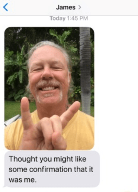 Hetfield also sent her a photo to prove it was him: