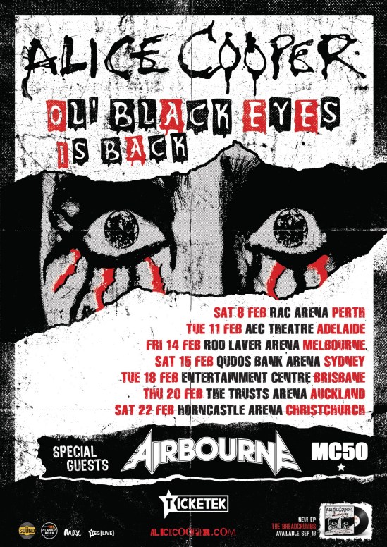 Alice Cooper has announced a headlining Australian/New Zealand tour with Airbourne and Wayne Kramer’s MC50. Here’s the dates: