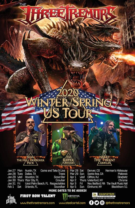 The Three Tremors, the band featuring Tim “Ripper” Owens (ex-Judas Priest/Iced Earth, etc.), Harry “The Tyrant” Conklin (Jag Panzer), and Sean “The Hell Destroyer” Peck (Cage, etc.), have announced a U.S. headlining tour. You can find the dates for that run below. As previously reported, the group will also be releasing their new 3-disc set, “The Three Tremors – The Solo Versions,” on November 15.