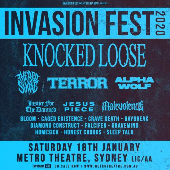 The lineup has been revealed for the 2020 Invasion Fest. That event will take place at the Metro Theatre in Sydney, Australia on January 18 and it will feature the following: Knocked Loose, The Red Shore (reunion show), Terror, Alpha Wolf, Justice For The Damned, Jesus Piece, Malevolence, Bloom, Caged Existence, Crave Death, Daybreak, Diamond Construct, Falcifer, Gravemind, Homesick, Honest Crooks, and Sleep Talk.