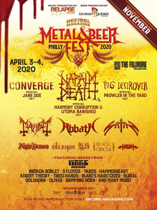 Abbath and Idle Hands have been added to the 2020 “Decibel Metal And Beer Fest” in Philadelphia, PA. That event will take place on April 3-4 at The Fillmore and it will also feature: Converge (performing “Jane Doe“), Napalm Death (performing “Harmony Corruption” and “Utopia Banished“), Pig Destroyer (performing “Prowler In The Yard“), Mayhem, Satan, Night Demon, Un, Magic Circle and Haunt. The following breweries will also be taking part in the festival: Wake Brewing, Broken Goblet, 3 Floyds, Yards, Hammerheart, Adroit Theory, Tired Hands, Blake’s Hard Cider, etc.