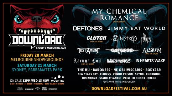 The first set of bands have been revealed for the 2020 Download Festival events in Australia. The Melbourne show will be held at the Showgrounds on March 20, while the Sydney show will be held at Parramatta Park on March 21. Here’s the lineup: My Chemical Romance, Deftones, Jimmy Eat World, Clutch, Ministry, In Flames, Testament, Carcass, Alestorm, Lacuna Coil, Hands Like Houses, In Hearts Wake, The Hu, Baroness, Ne Obliviscaris, Bodyjar, New Years Day, Clowns, Venom Prison, Skynd, Thornhill, Disentomb, Stand Atlantic, Plini, Redhook, and Dregg.