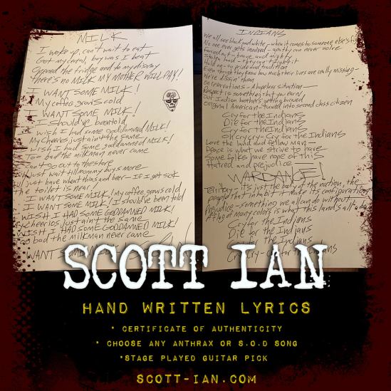 “Choose any Anthrax or S.O.D. song and I will personalize or dedicate them to anyone you want. The lyrics will come with a signed certificate of authenticity and a stage-played guitar pick.”