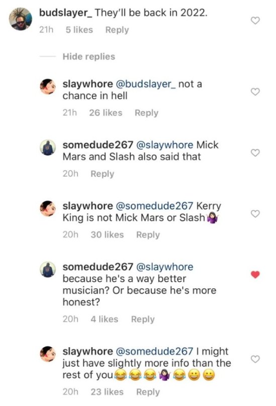 Slayer played their final show on November 30 and many fans have wondered if the band will stay gone or end up reuniting like all of the other bands that have returned after heading out on farewell tours. Now, while responding to fans on Twitter, Kerry King’s wife Ayesha King said there is “not a chance in hell” that the group will ever reunite. After it was mentioned that Slash was wrong about Guns N’ Roses and that Mick Mars was wrong about Mötley Crüe, she said “Kerry King is not Mick Mars or Slash” and that she “might just have slightly more info” than everyone else. She also added the following when someone said that they don’t believe the recent show will be Slayer’s last: “you can bet on it.” Screenshots of those responses and more can be seen below: