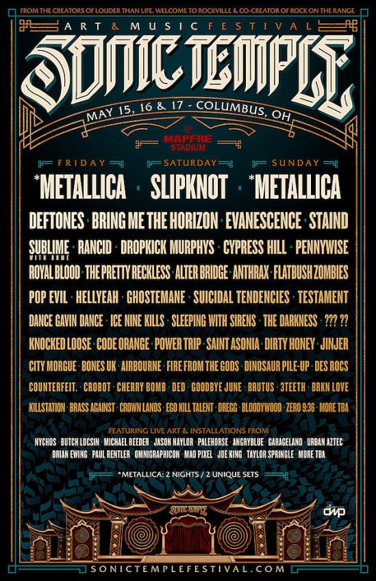 The lineup has been revealed for the 2020 Sonic Temple Art + Music Festival. The event will take place at MAPFRE Stadium in Columbus, OH on May 15-17 and it will feature the following artists: Metallica, Slipknot, Deftones, Bring Me The Horizon, Evanescence, Staind, Sublime With Rome, Rancid, Dropkick Murphys, Cypress Hill, Pennywise, Royal Blood, The Pretty Reckless, Alter Bridge, Anthrax, Flatbush Zombies, Pop Evil, HELLYEAH, Ghostemane, Suicidal Tendencies, Testament, Dance Gavin Dance, Ice Nine Kills, Sleeping With Sirens, The Darkness, Knocked Loose, Code Orange, Power Trip, Saint Asonia, Dirty Honey, Jinjer, City Morgue, Bones UK, Airbourne, Fire From The Gods, Dinosaur Pile-Up, Des Rocs, Counterfeit, Crobot, Cherry Bombs, DED, Goodbye June, Brutus, 3TEETH, BRKN LOVE, Killstation Brass Against, Crown Lands, Ego Kill Talent, DREGG, Bloodywood, and Zero 9:36.