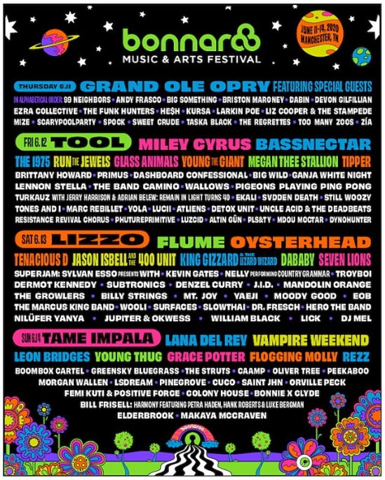 The lineup has been revealed for the 2020 Bonnaroo Music & Arts Festival. The event will take place at Great Stage Park in Manchester, TN on June 11-14 and it will feature: Tool, Primus, Tenacious D, Oysterhead, King Gizzard And The Lizard Wizard, Uncle Acid And The Deadbeats, Flogging Molly, The Struts, The Marcus King Band, The Regrettes, Vampire Weekend, Run The Jewels, and more.