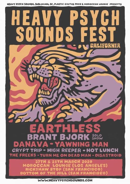 Earthless, Brant Bjork (solo show), Danava, Yawning Man, Crypt Trip, High Reeper, Hot Lunch, The Freeks, Turn Me On Dead Man, and Disastroid have been booked for the 2020 Heavy Psych Sounds Fest. That event will take place on March 27-28 at the Moroccan Lounge in Los Angeles, CA and at the Rickshaw Stop and Bottom Of The Hill in San Francisco, CA.