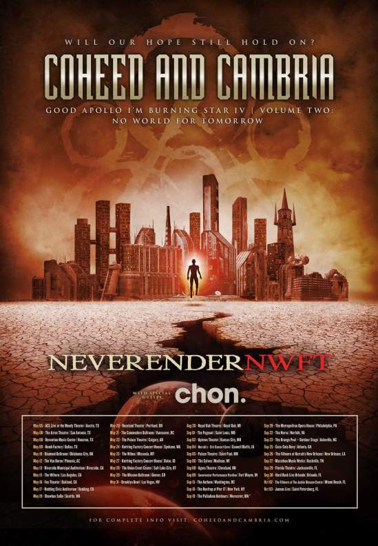 Coheed And Cambria have announced the dates for their “Neverender: NWFT” tour with Chon. The trek will find the band performing “Good Apollo, I’m Burning Star IV, Volume Two: No World for Tomorrow“ in full.