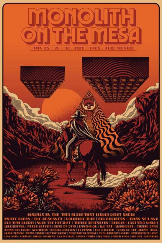 The lineup has been revealed for the 2020 Monolith On The Mesa festival. The event will take place at Taos Mesa Brewing and Hotel Luna Mystica in Taos, New Mexico on May 28-30 and it will feature: Brant Bjork, The Obsessed, Yawning Man, Big Business, Mars Red Sky, Old Man Gloom, Ruby The Hatchet, Mondo Generator, Nebula, Ecstatic Vision, Weedeater, Fatso Jetson, Sons Of Otis, Earthride, Wo Fat, Warhorse, Mondo Drag, Mark Deutrom, Khemmis, Magic Castles, El Perro, The Otolith, Year Of The Cobra, Duel, Heavy Temple, Vatra, Great Electric Quest, Mountain Of Smoke, Mlny Parsons, Kyoty, Destroyer Of Light, Love Gang, Relaxer, Bridge Farmers, Red Feather, Street Tombs, Red Mesa, Prism Bitch, Sun Dog, and Distances.