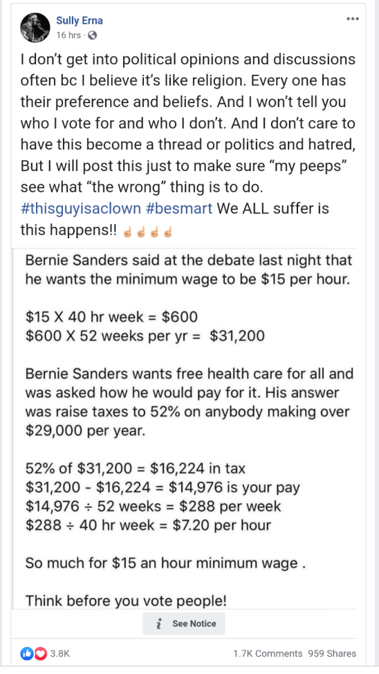 Godsmack’s Sully Erna has apparently contributed to the spread of false information about Democratic presidential candidate Sen. Bernie Sanders. The frontman shared a viral post that has been flagged by Facebook for falsely claiming that Sanders suggested placing a 52% tax on income earnings over $29,000 to pay for free health care, which would make his proposed minimum wage increase pointless. In actuality, the 52% tax Sanders mentioned was for income earnings over $10 million.