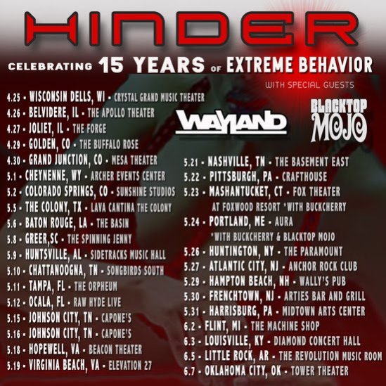 Hinder will be celebrating the 15th anniversary of “Extreme Behavior” by performing it in full on a spring headlining tour. Wayland and Blacktop Mojo will open.