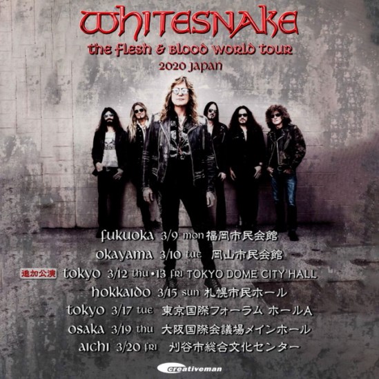 “We regret to announce that Whitesnake’s Japan Tour which had been scheduled for March has been unavoidably postponed due to the ongoing threat of the Coronavirus. Currently, we are working on rescheduling the dates. Your purchased tickets for the original dates will be valid for the rescheduled dates. Please ensure you keep your tickets safe. For those customers who wish to receive a refund, we will announce details of the refund process once we announce the rescheduled dates. We deeply apologize to all parties concerned especially those customers who bought tickets and have been looking forward to the Whitesnake shows.”