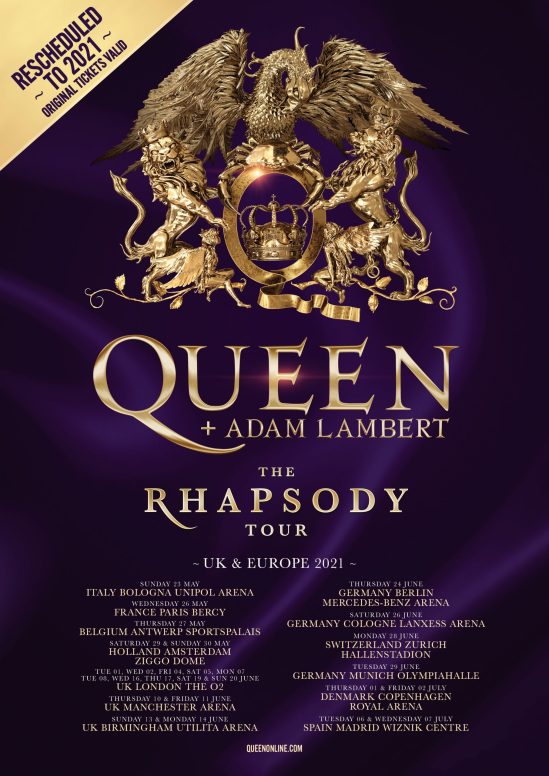 Queen + Adam Lambert have postponed their European/UK tour due to the coronavirus pandemic. The trek will now take place in 2021.