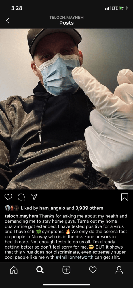 “Thanks for asking me about my health and demanding me to stay home guys. Turns out my home quarantine got extended. I have tested positive for a virus and I have c19 symptoms. We only do the corona test on people in Norway who is in the risk zone or work in health care. Not enough tests to do us all. I’m already getting better so don’t feel sorry for me. BUT it shows that this virus does not discriminate, even extremely super cool people like me with #4millionnetworth can get shit.”